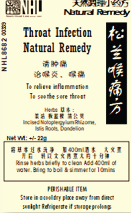 Throat Infection Natural Remedy is used to treat respiratory infections, clear heat, and detoxify the body. Incised Notopterygium Rhizome addresses symptoms related to wind-cold, Isatis Root tackles viral infections, and Dandelion provides detoxifying and anti-inflammatory effects. Together, they can be used to alleviate symptoms of the common cold, flu, sore throat, and other inflammatory conditions.